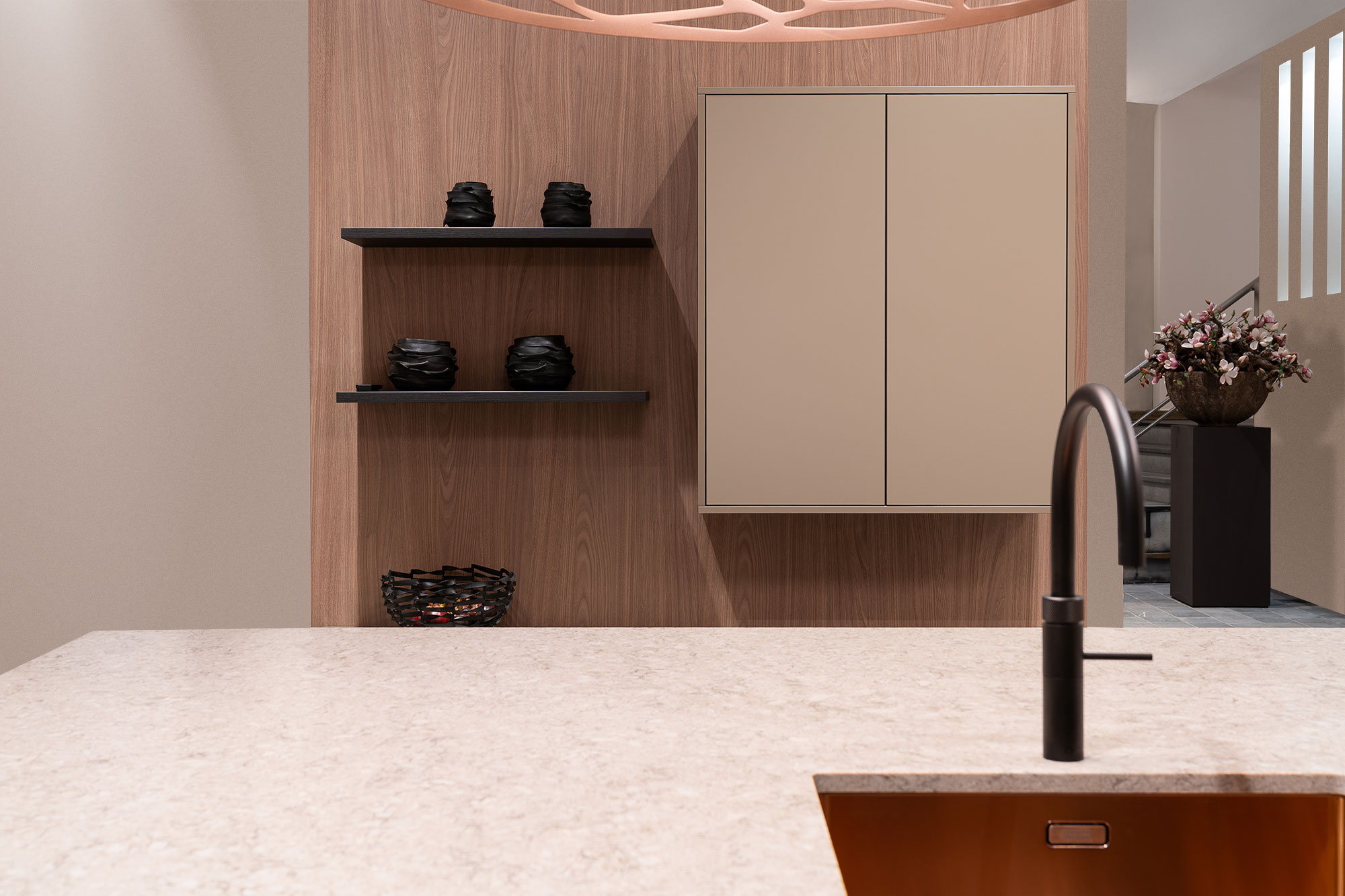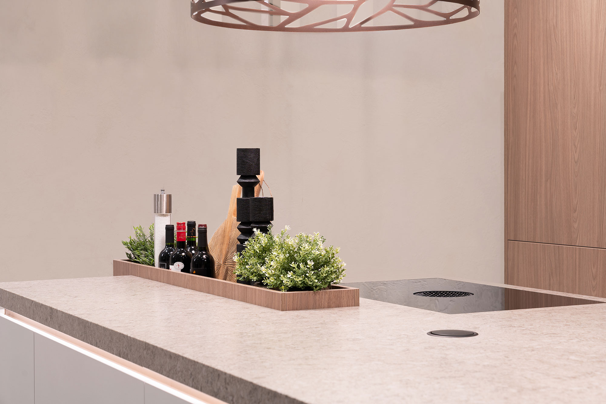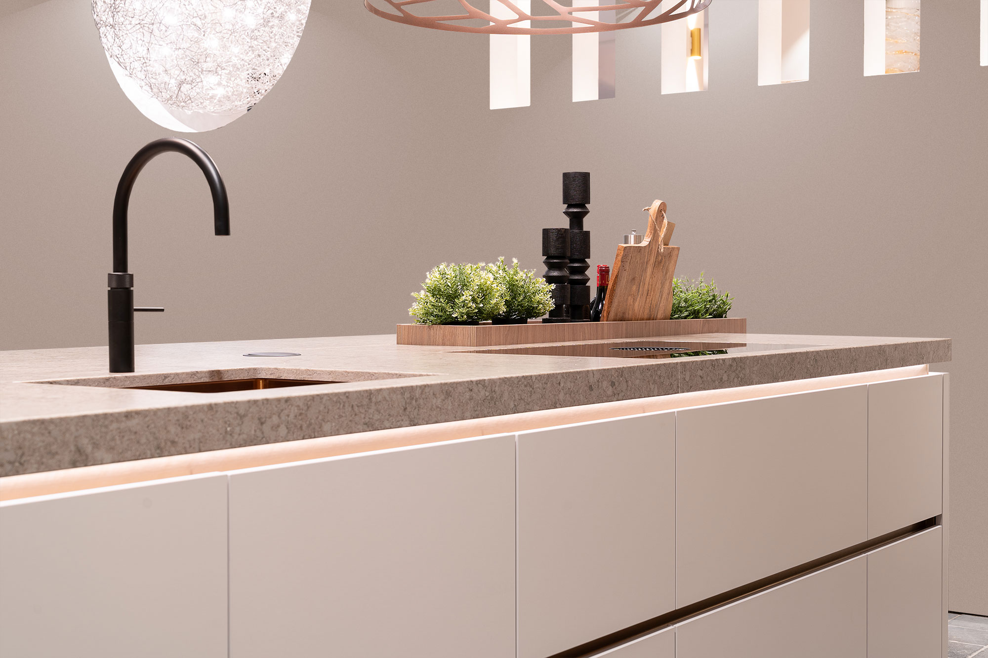 Natuurlijke materialen komen het mooist tot hun recht in een harmonieuze omgeving. Denk aan zachte aardetinten, warme houtkleuren of lichte grijsnuances die samen een rustgevende basis vormen. In zo’n omgeving staat het materiaal centraal en is er ruimte voor balans tussen textuur, kleur en licht. Door matte oppervlakken toe te passen, die het licht subtiel breken, ontstaat een zachte gloed die de keuken een serene uitstraling geeft. Zo wordt de keuken niet alleen een plek om te koken, maar een rustpunt in huis waar alles klopt, van het lijnenspel tot de materiaalbeleving.